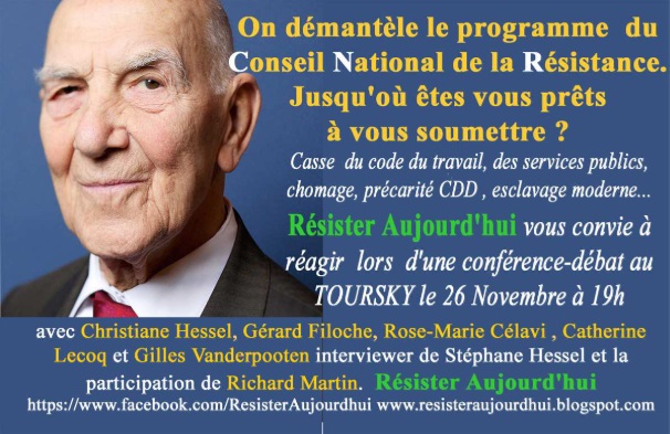 « On démantèle le programme du Conseil National de la Résistance, jusqu’où êtes-vous prêts à vous soumettre ? ». C’est le thème du débat auxquels Christiane Hessel et Gilles Vanderpooten sont conviés, aux côtés de Gérard Filoche, Rose-Marie Célavi, Catherine Lecoq et Richard Martin.